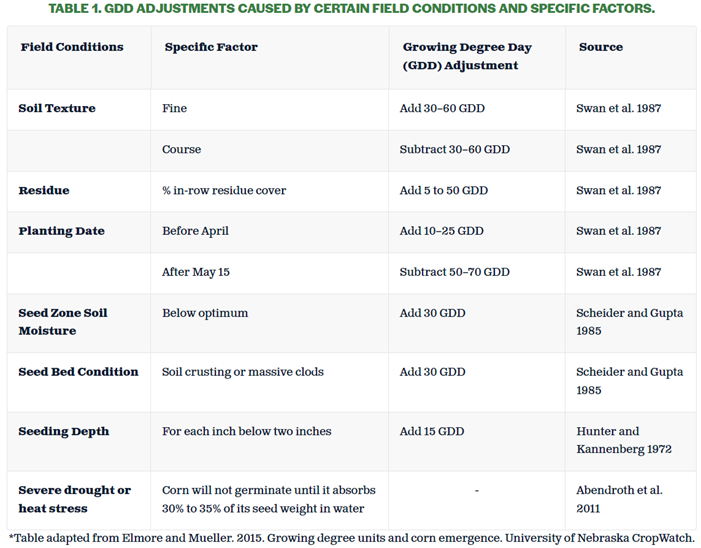 With corn and soybean planting well underway in the Western Corn Belt, the next step is monitoring our crops emergence. This spring can be described as later planting due to colder soil temperatures. On average, corn requires approximately 100-125 growing degree days to emerge. However, field conditions and planting date can change the number of growing degree units required. (Table 1)