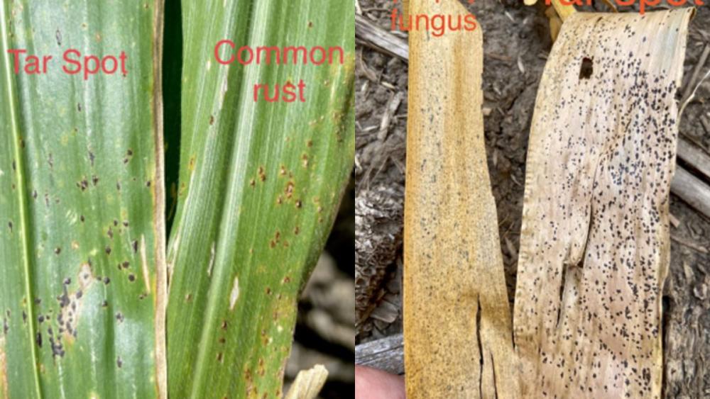 - A fungal pathogen that has oval lesions. This fungus will also be raised when it is in reproductive stages. When you rub your finger on the raised lesions the rust-colored spores will rub off on your fingers. This has a more consistent shape than the tar spot lesions. This can also be present all over the plant (leaf surfaces, underneath leaves, husks). This is treatable with fungicides however it is usually not economically viable to treat for.